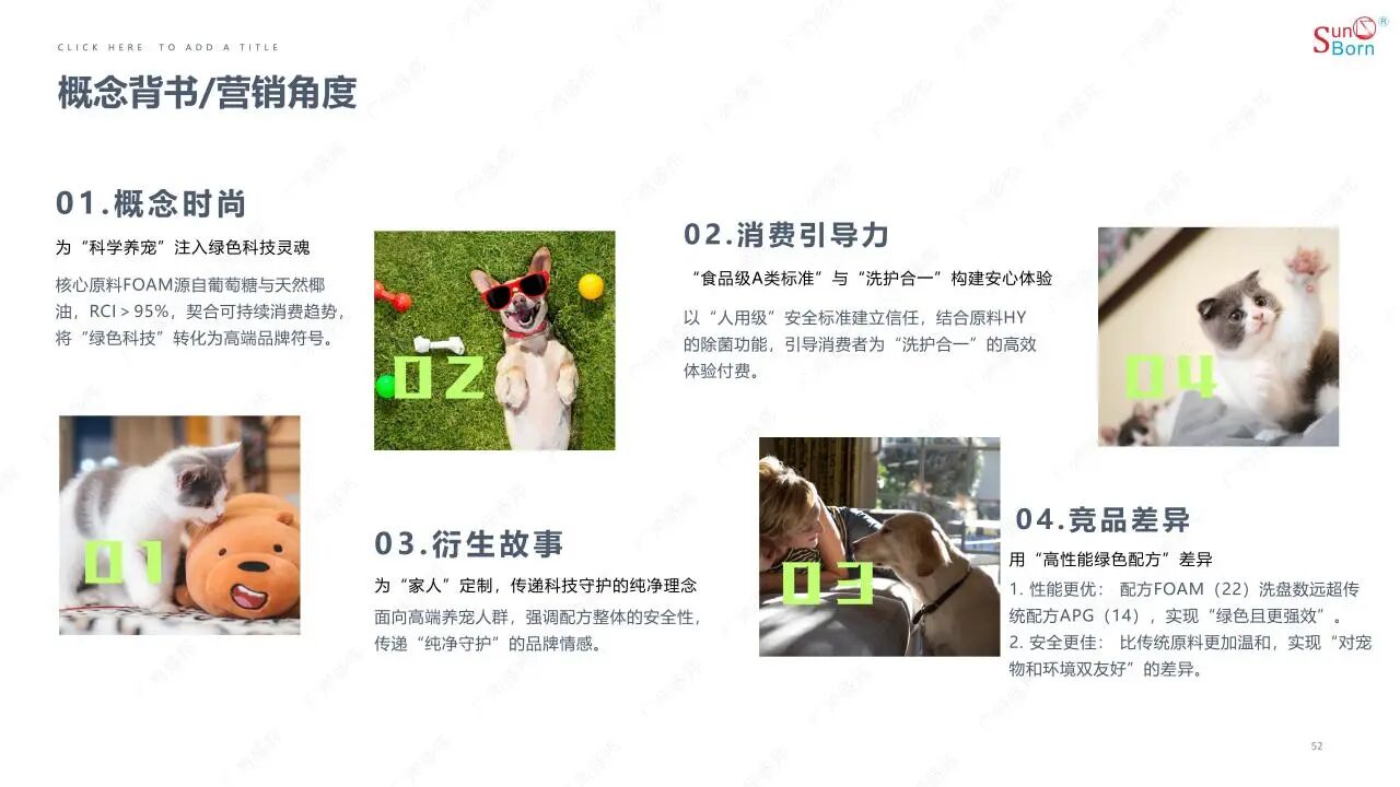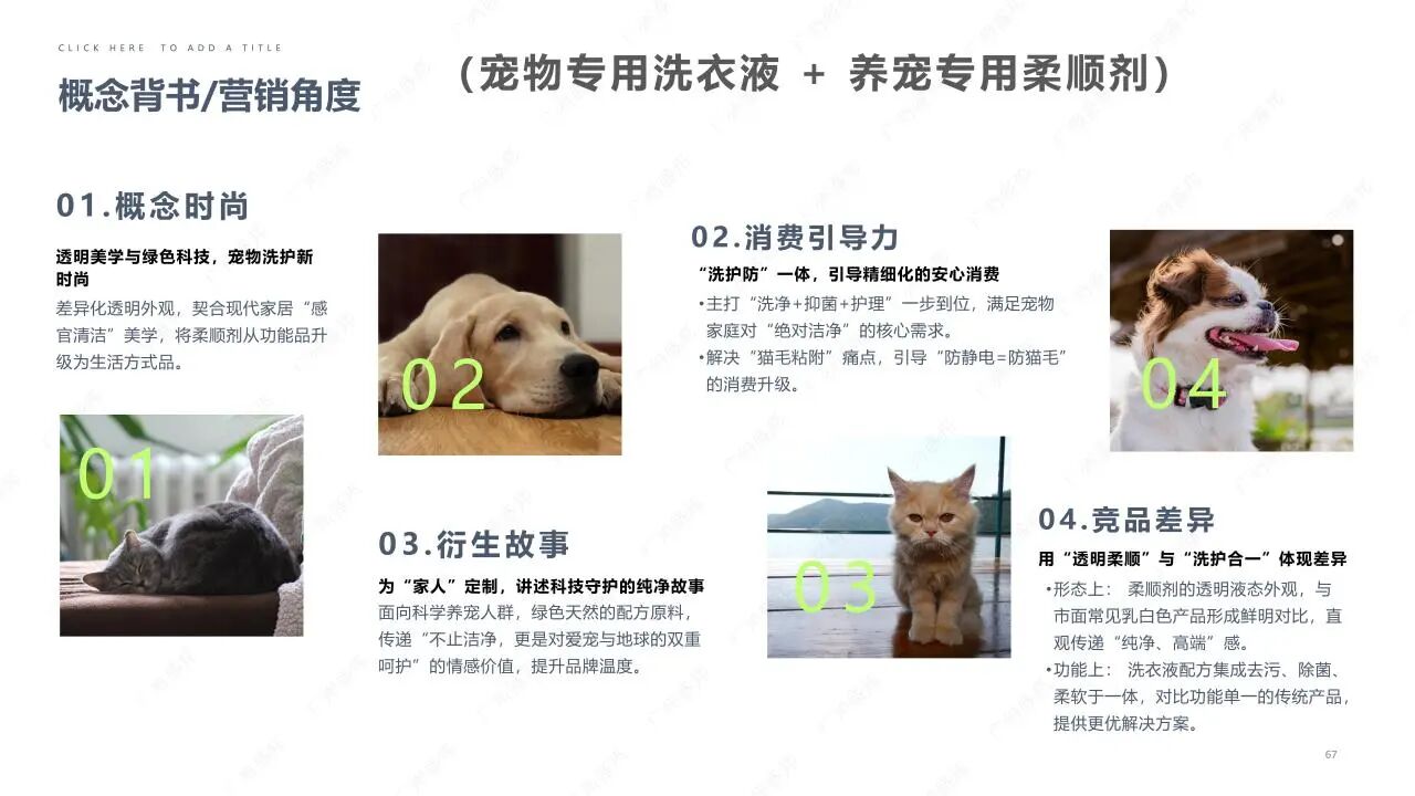 我们针对狗/猫两种宠物的不同需求提供了细分解决方案,为品牌方从功能、概念、场景三个角度提升其与消费者之间的共鸣。